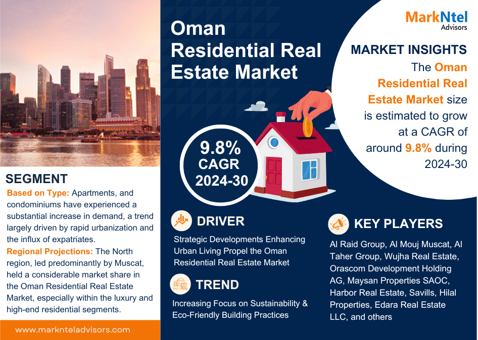 As per recent study by MarkNtel Advisors The Oman Residential Real Estate Market size is estimated to grow at a CAGR of around 9.8% during the forecast period, i.e., 2024-30.