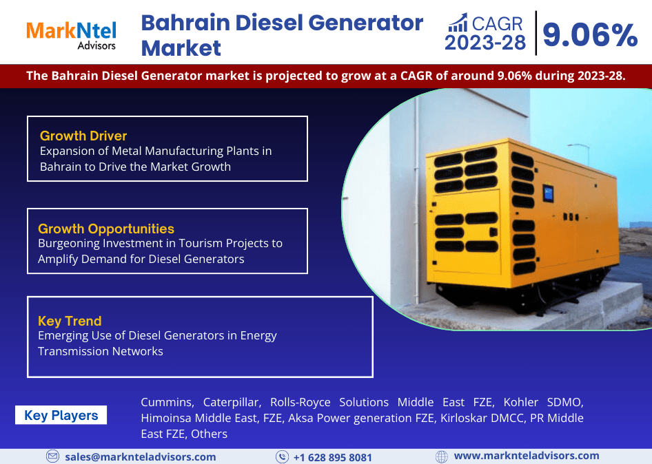 As per recent study by MarkNtel Advisors The Bahrain Diesel Generator market is projected to grow at a CAGR of around 9.06% during the forecast period, i.e., 2023-28.