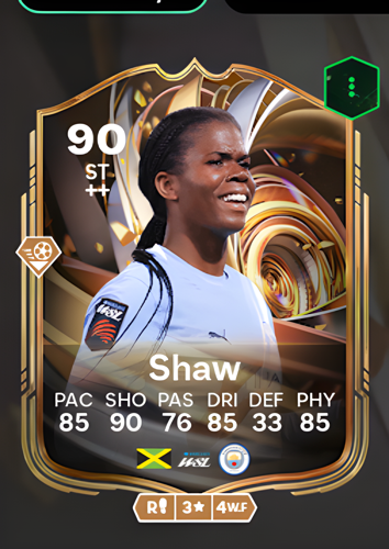 Khadija Shaw's Ratings Reload card features her as a formidable Striker, boasting an impressive overall rating of 90. With standout attributes including 85 pace, 90 shooting, and 85 dribbling, Shaw is a constant threat in the final third, capable of outpacing defenders and finishing with clinical precision. Her 85 physicality ensures she can hold off challenges and maintain possession under pressure, while a solid 76 passing allows her to link up effectively with teammates. As a striker, these qualities make her an invaluable asset for breaking down defenses, capitalizing on scoring opportunities, and securing decisive goals when it matters most.