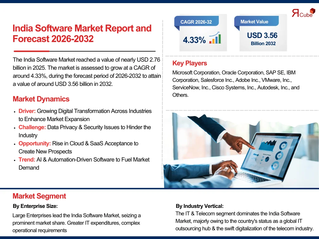 The India Software Market reached a value of nearly USD 2.76 billion in 2025. The market is assessed to grow at a CAGR of around 4.33%, during the forecast period of 2026-2032 to attain a value of around USD 3.56 billion in 2032. The industry comprises a diverse range of software products & services, such as infrastructure software, enterprise software, SaaS (Software-as-a-Service), and software development services.